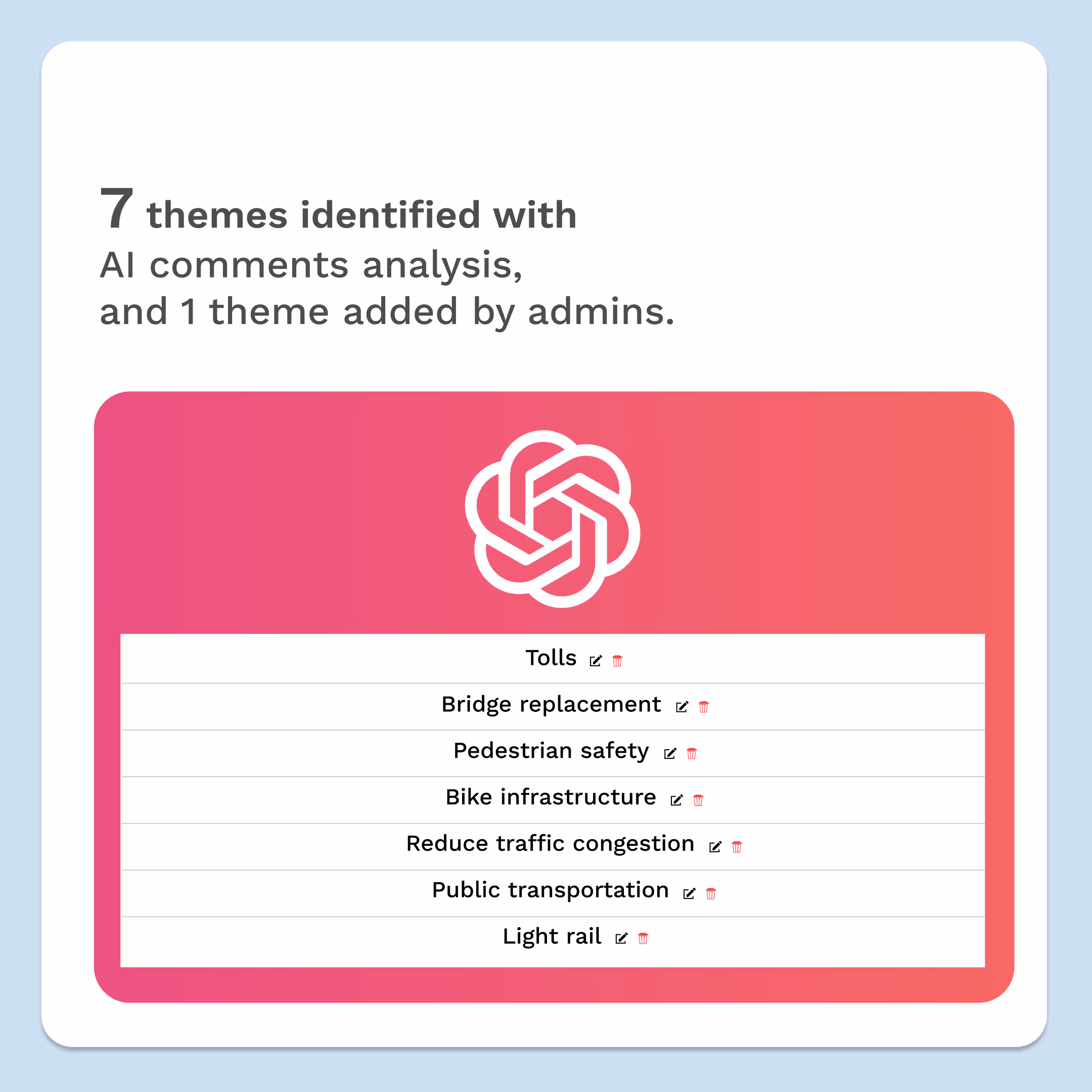 With PublicInput, every comment, question, and suggestion is captured, categorized, and distilled into clear, actionable insights—automatically. So you can lead with confidence, report with clarity, and show your community they're being heard.